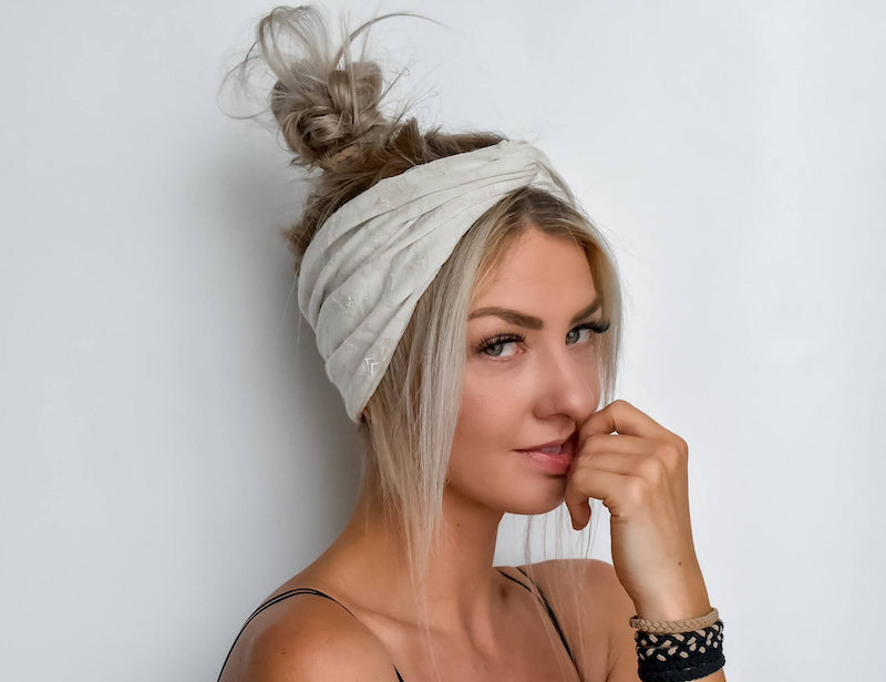Our butter soft Tie Bands are multi-functional. They can be worn as a tie back headband, tied as a top knot headband, used as a hair scarf/bandana or tied in a bow for a cute ponytail/braid accessory, or used for heatless curls. Onyx is true black color that will match any of your outfits. Cloud is a brilliant white color that will look gorgeous with any hair color